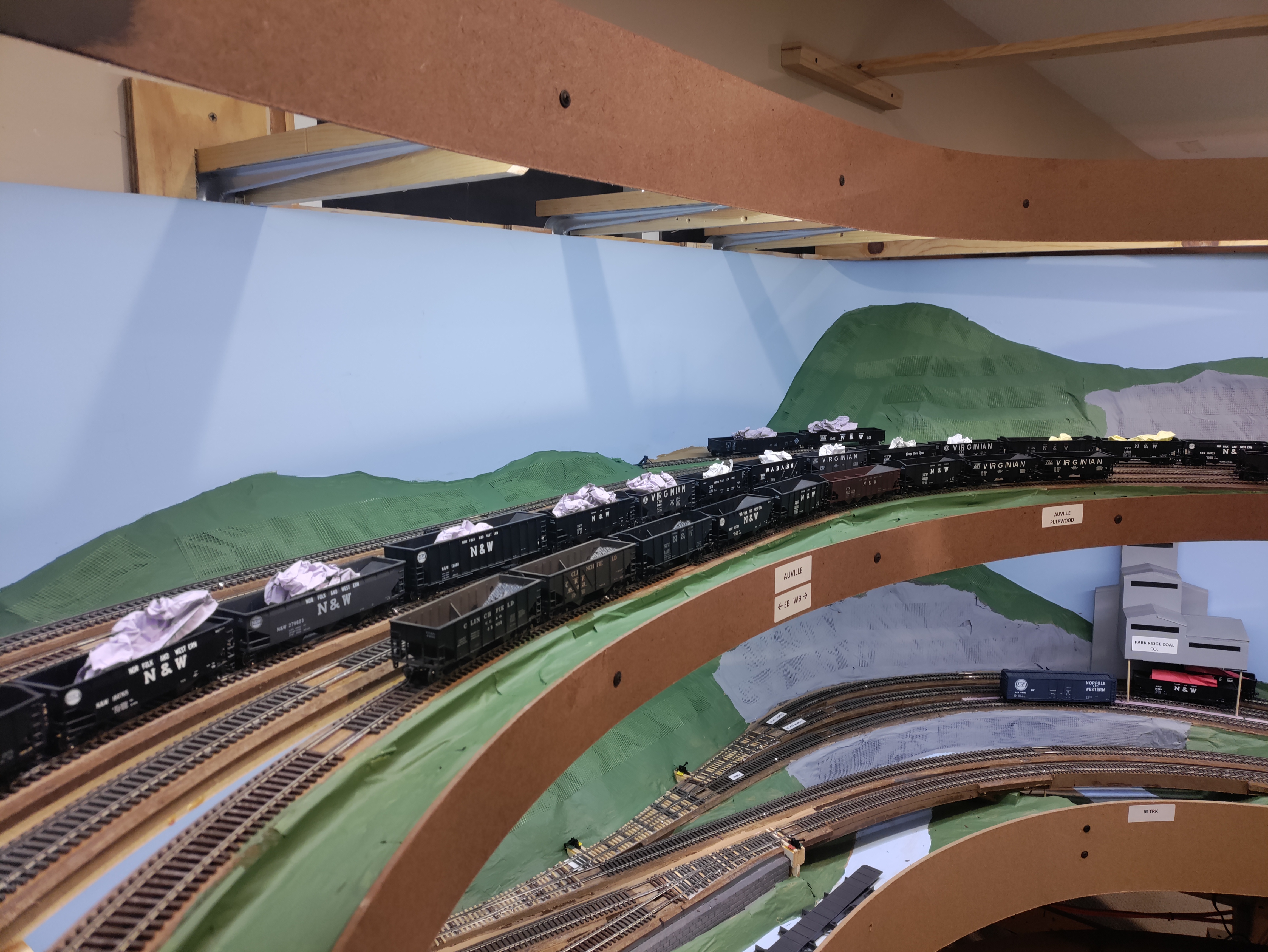 Construction on the layout began in October, 2020. Using spline roadbed construction throughout, all track is installed and operational. Basic scenic landforms are in with cardboard building mockups in place, and scenery construction is pending. Set in 1966, the "Pokey" features 1st and 2nd generation diesels that are all sound equipped with ESU LokSound decoders and Keep Alive capacitors for reliable operation. Momentum is set modestly to provide prototype realism, and independent brakes are available for those times when stopping distance is misjudged! Bluefield and Williamson are represented by staging yards at each end of the layout. The mainline is a double track dog bone with numerous crossovers to keep traffic flowing. During op sessions a train run by the dispatcher (layout owner) circulates the 742' mainline loop continuously, providing traffic that enhances the prototype "feel" of the railroad. All turnouts are hand laid Fast Track turnouts, or hand laid custom curved turnouts built in place. Rail is Atlas code 83 flex track. Ops on the "Pokey" are meant to be relaxed, low stress, and maximum fun for the operators. Trains follow a sequence schedule. Dispatching is laid back, informal verbal authority. Car forwarding is handled by simple and easy to read car cards and waybills. Train cards for each job are given to operators so they know where their train is to go, and what switching it needs to do. Deciding how to do the switching however, is left up to each operator to decide. Beside mainline coal drags and through freights, there are four local coal shifter jobs to service the six tipples on the layout, six local freights to service other industries on the layout, and one local passenger train. Mainline trains run 24-30 cars, and locals typically run 6-12 cars. A yardmaster handles the main freight yard, but may also run locals if they finish their switching early. In that case, the next local that comes into the yard becomes the new yardmaster, mixing things up a bit, and providing fun variety for the operators. Layout control is via wireless NCE push button throttles. The layout is also Wi-Fi compatible, for those who prefer to use Wi-Fi throttles or throttle apps on their cell phones. Click this link to see a: Norfolk & Western Pocahontas District Track Plan